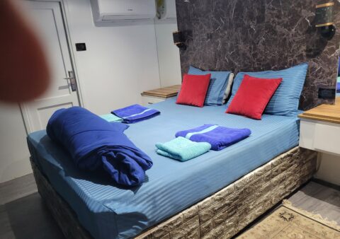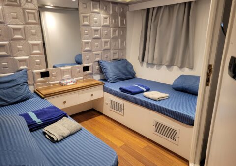 The yacht accommodates up to 24 guests in 12 comfortable cabins: